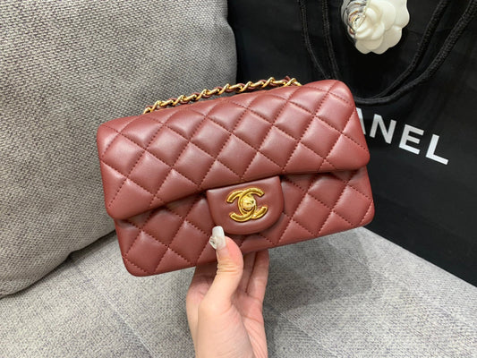 MINI RECTANGLE FLAP BAG 20CM BURGUNDY LAMBSKIN GOLD HARDWARE
