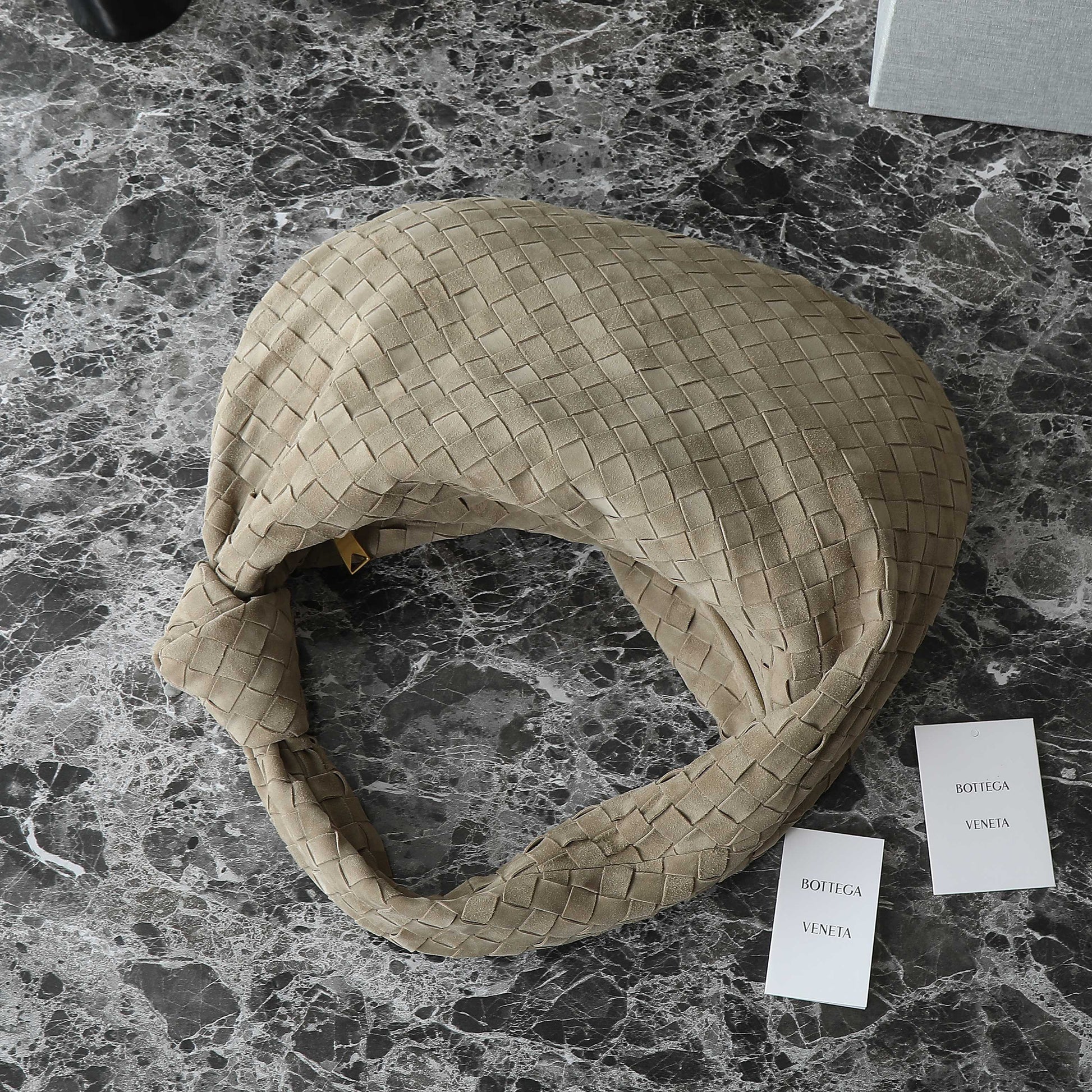 BOTTEGA VENETA 25S SMALL JODIE 48 IN MUTED TAUPE SUEDE GOLD HARDWARE
