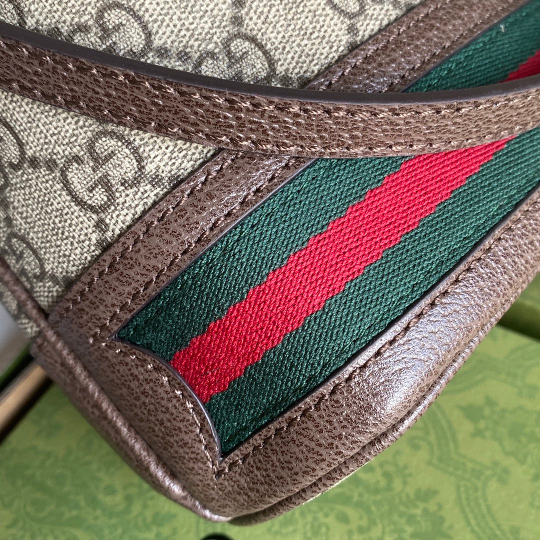 OPHIDIA MINI BUCKET BAG 18 WITH WEB IN BEIGE EBONY CANVAS MIX BROWN CALFSKIN